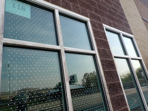 Windows at East Junior High are covered with small white adhesive dots to protect birds from hitting them.